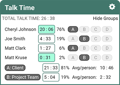 Use it to track total time spent talking by your company vs your client, or men versus women, or teachers and students, etc. You can group participants however you wish, on the fly.